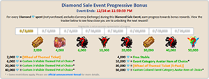 Diamond Progressive Bonus: We are also doing a special Progressive Bonus Event! For every so many Diamonds that you spend, you can earn up to 6 special bonus rewards. We have added 2 additional bonus rewards for this event!