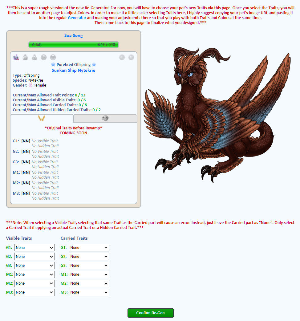 Unlike previous Revamps, for the Nytekrie, ALL existing pet's Traits were wiped. Every Nytekrie on the site post Revamp is now all 'NN' for every Trait slot. Their original Traits were catalogued and depending on what they had determines what they can re-allocate now. In order to re-allocate your pet's Traits, just visit their profile page and click the button.