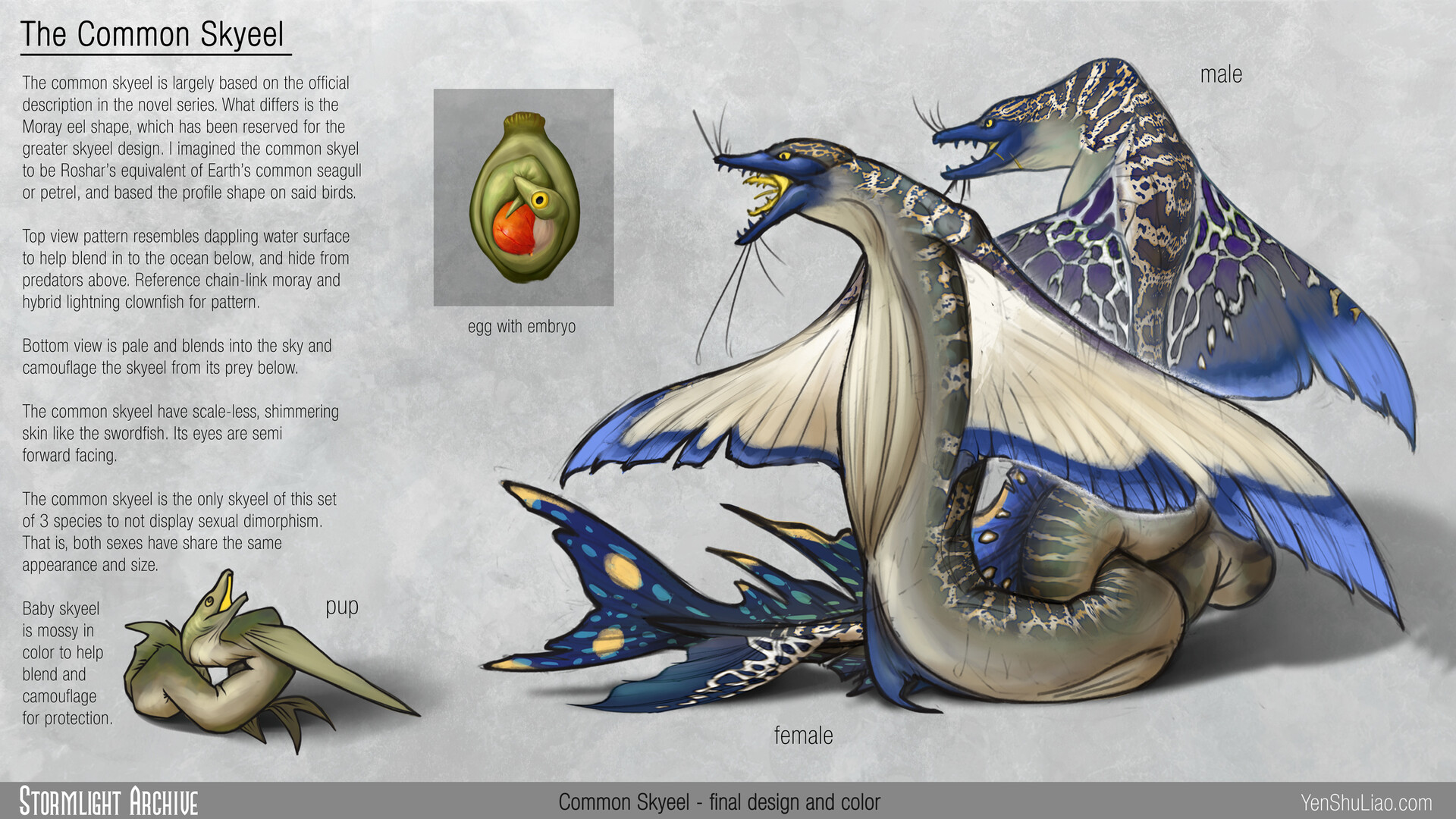 other: Females are duller then the males of the species and take care of the young and the males are hunters of food but during breeding season they switch off when incubating the eggs and the females will hunt when the males sit on the eggs and vice versa they build their nests on sea cliffs and the nests are made of kelp and sea grass they reuse their nests every year.Their diet includes deep sea squid and shallow water squid,reef fish,tuna,small sharks[like reef sharks]and deep sea fish[like angler fish] and these dragons can breathe both water and air but prefer to breathe water also these dragons tend to live for around 30 dragon years.