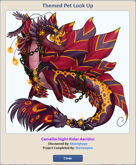 -Made another update to the Themed Pet Codex. When viewing a specific Themed Pet's information, the window should now be properly centered aligned and will auto resize to fit a player's screen. Also, information is now displayed showcasing the first Player to obtain each Themed Pet and the first Player to breed a full Visible Purebred Offspring for each Themed Pet. We still plan on adding more information to the Codex, including categorical information such as where the Themed Pet originated from, date released, etc.