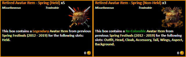 There will be variations of these items available for each of the four major festivals: Spring, Summer, Fall, and Winter. These items can be purchased for a [Peerless Avatar Token] each.