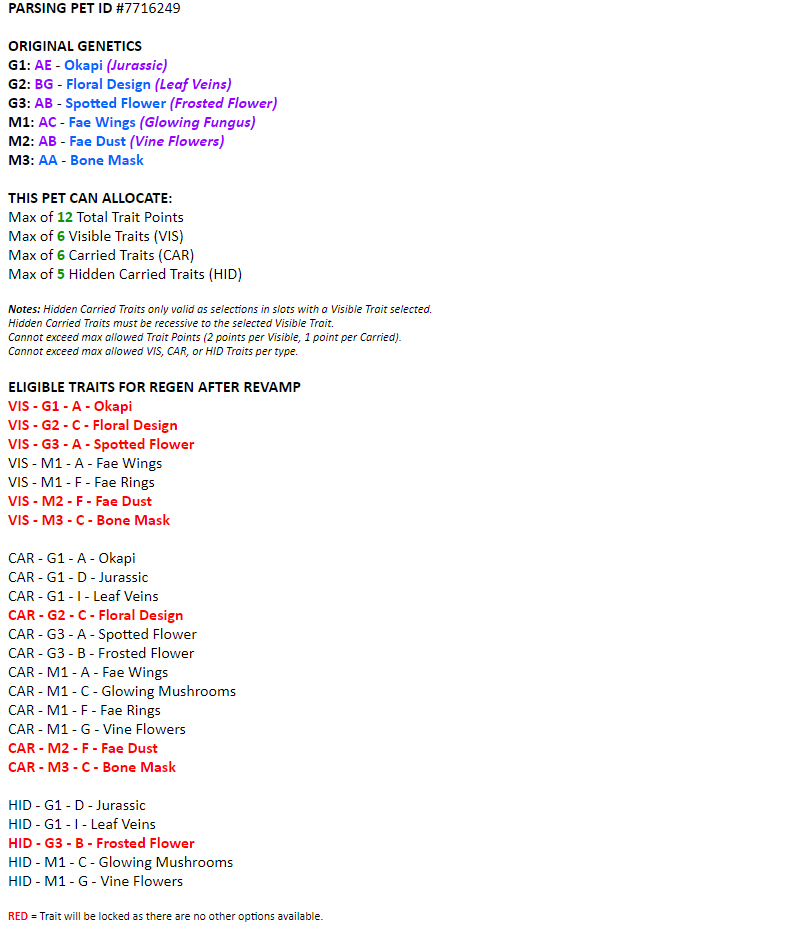 The list of Traits at the bottom indicate the options that this Faelora will have after the Revamp is live. In some cases, like their G1, their only option for the Visible Trait will remain Okapi. Therefore, it's highlighted in red to indicate that this will be locked on the Pet; there won't be any other option to choose so this Trait will just remain as is.