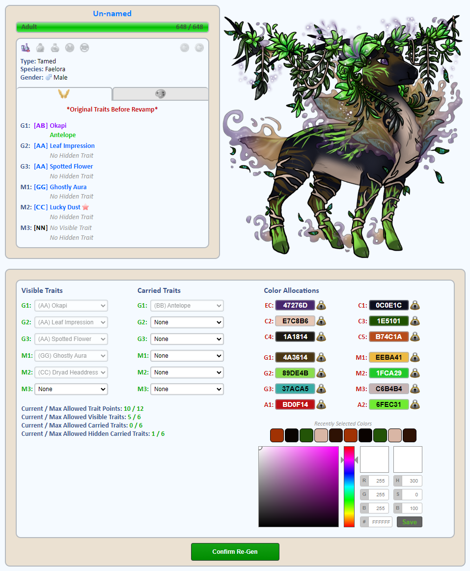 In addition to Traits, players will also be able to reallocate Colors based on things that have changed. Each Faelora is parsed individually and will have its own custom Re-Generation options based on its original Traits and information.