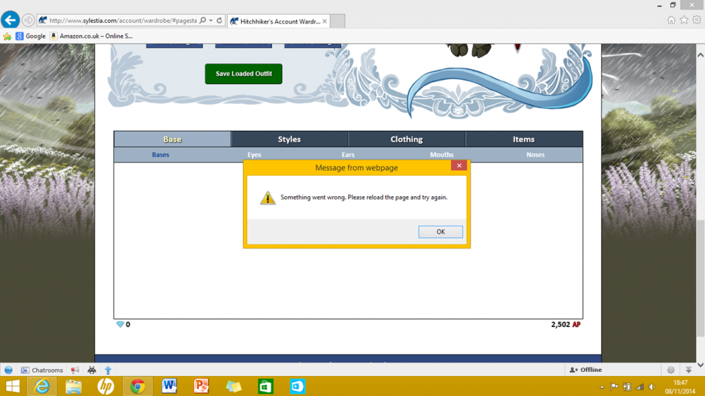 Naturally, I refreshed the page and tried again...and again...and again. I've tried deleting my cache and cookies, I've made sure Chrome is fully updated but nothing seems to work. Strangely it only happens on hair, eyes and mouth tabs while the rest are unaffected. If it helps, I think it started doing this after the first time I received a held item (worn mossy staff) and then used it in the inventory.