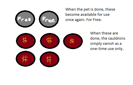 Brewing pets as they come just means that more cauldrons will be sitting there, soaking up space and overtaking the potential of using the two 'FREE' ones. Which ultimately, means you have to spend even more, again and again, and there may as well not be any free cauldrons for most players because they'll never see them again after buying up the extras.