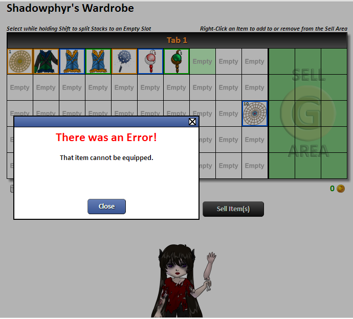 I didn't think of it earlier when I hit auto-sort that there was an empty space at the beginning of my wardrobe inventory, but now that I went to buy some more traps and move stuff around to re-equip the new quantity, I'm getting this error: